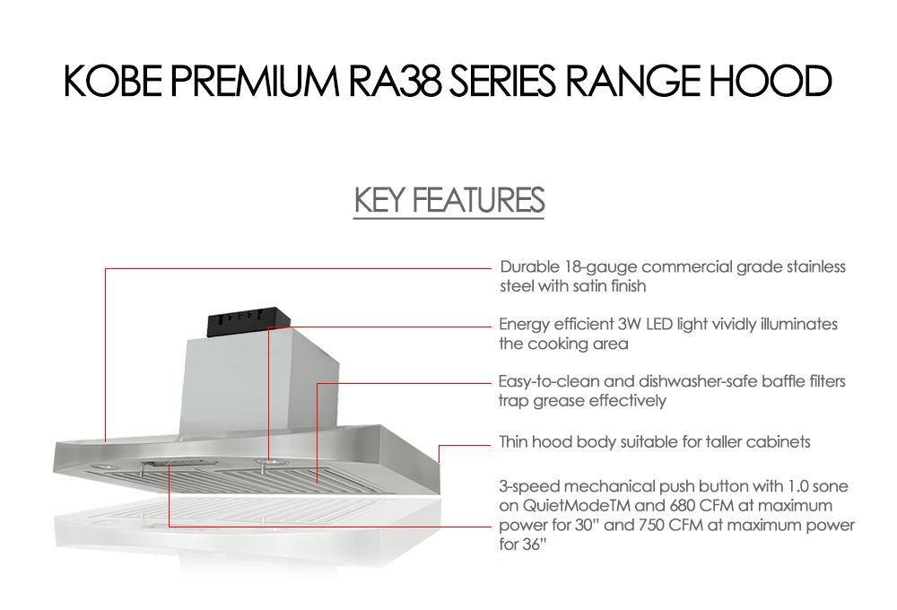 KOBE Range Hoods' RA38 series under cabinet range hood is a truly elegant slim-design hood that is perfect for taller cabinets, the unique front slope curve design will add a style to your kitchen design. This beautiful hood is handcrafted with durable 18-gauge commercial grade stainless steel with satin finish. It is equipped with 3-speed mechanical push button for easy operation, dishwasher-safe baffle filters, and energy efficient LED lights. Available as under cabinet or wall mount style with optional duct cover.