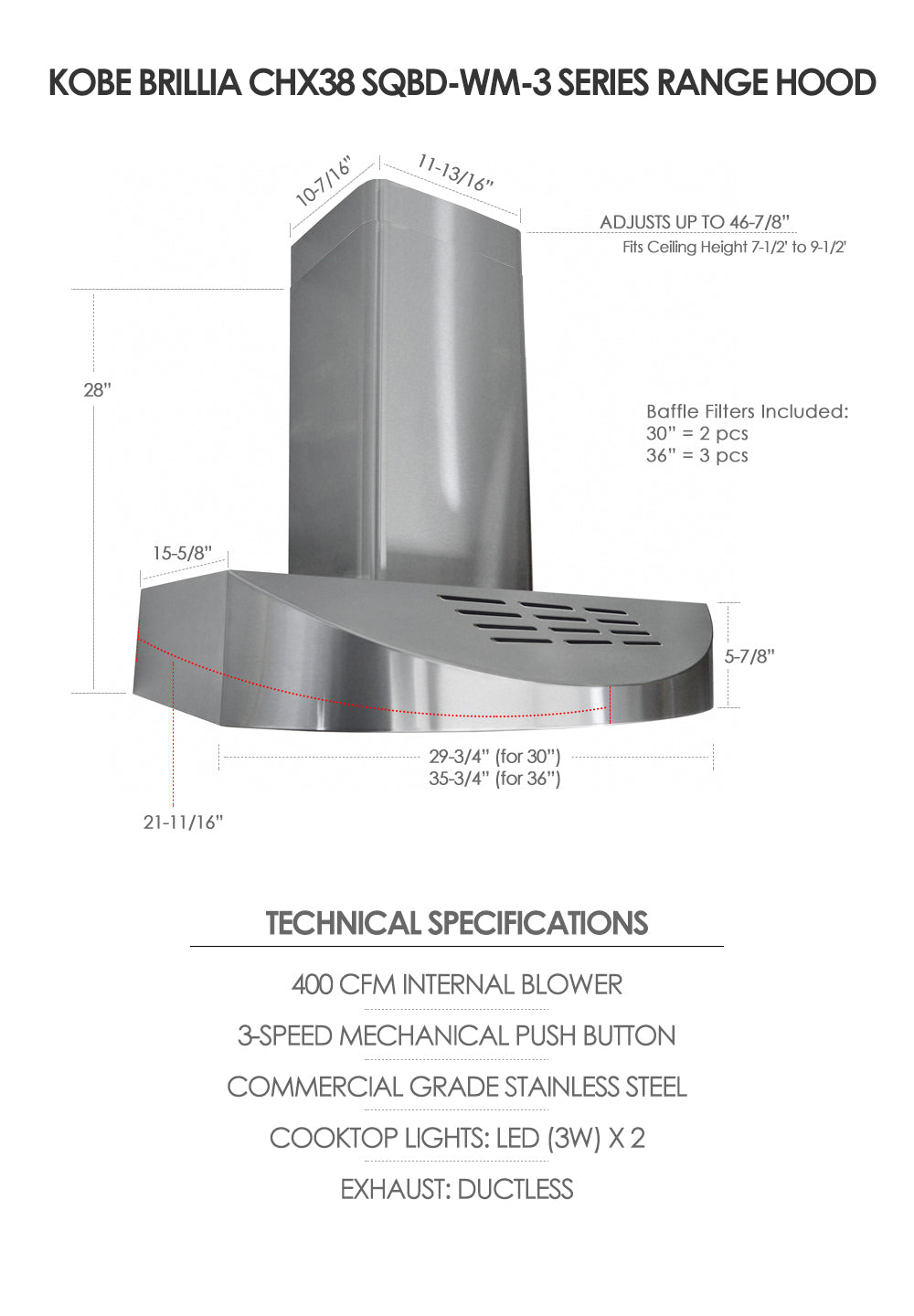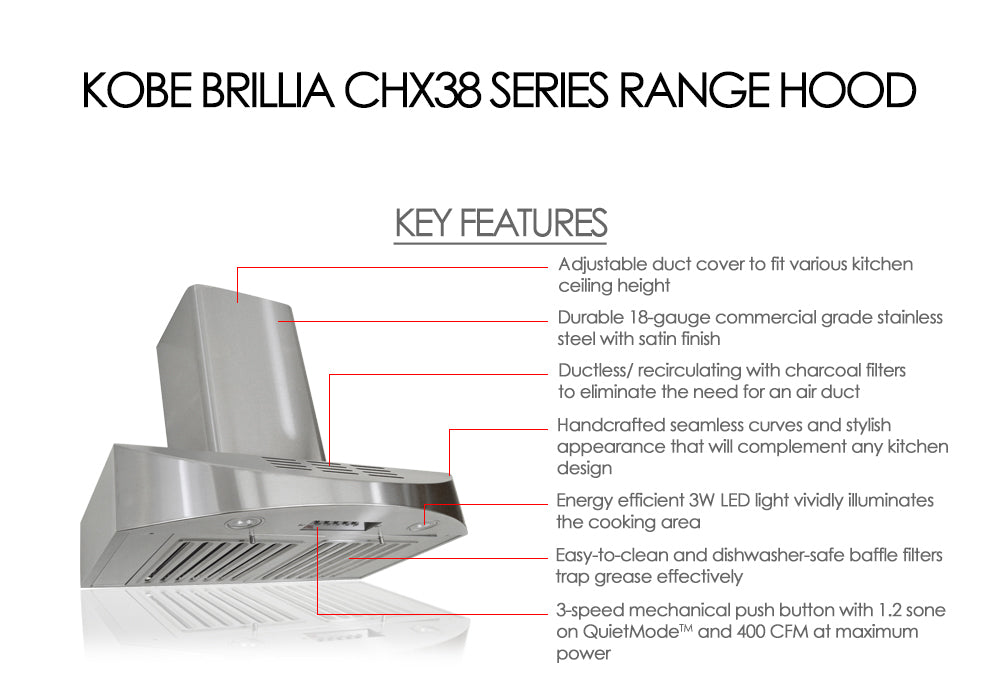 KOBE Range Hoods' CHX38 series wall mount range hood is a ductles / recirculating hood that is designed for the kitchen or cook area that do not vent out. This range hood is beautifully handcrafted with 18-gauge commercial grade stainless steel with satin finish. The unique front slope curve design will definitely add a style to your kitchen design! This hood is equipped with 3-speed mechanical push button, dishwasher-safe baffle filters and LED lights. It comes with 400 CFM internal blower and charcoal filters. This wall mount hood is designed to fit ceiling height between 7-1/2ft and 9-1/2ft (Min 90" to Max 112"). This item ships in multiple boxes.